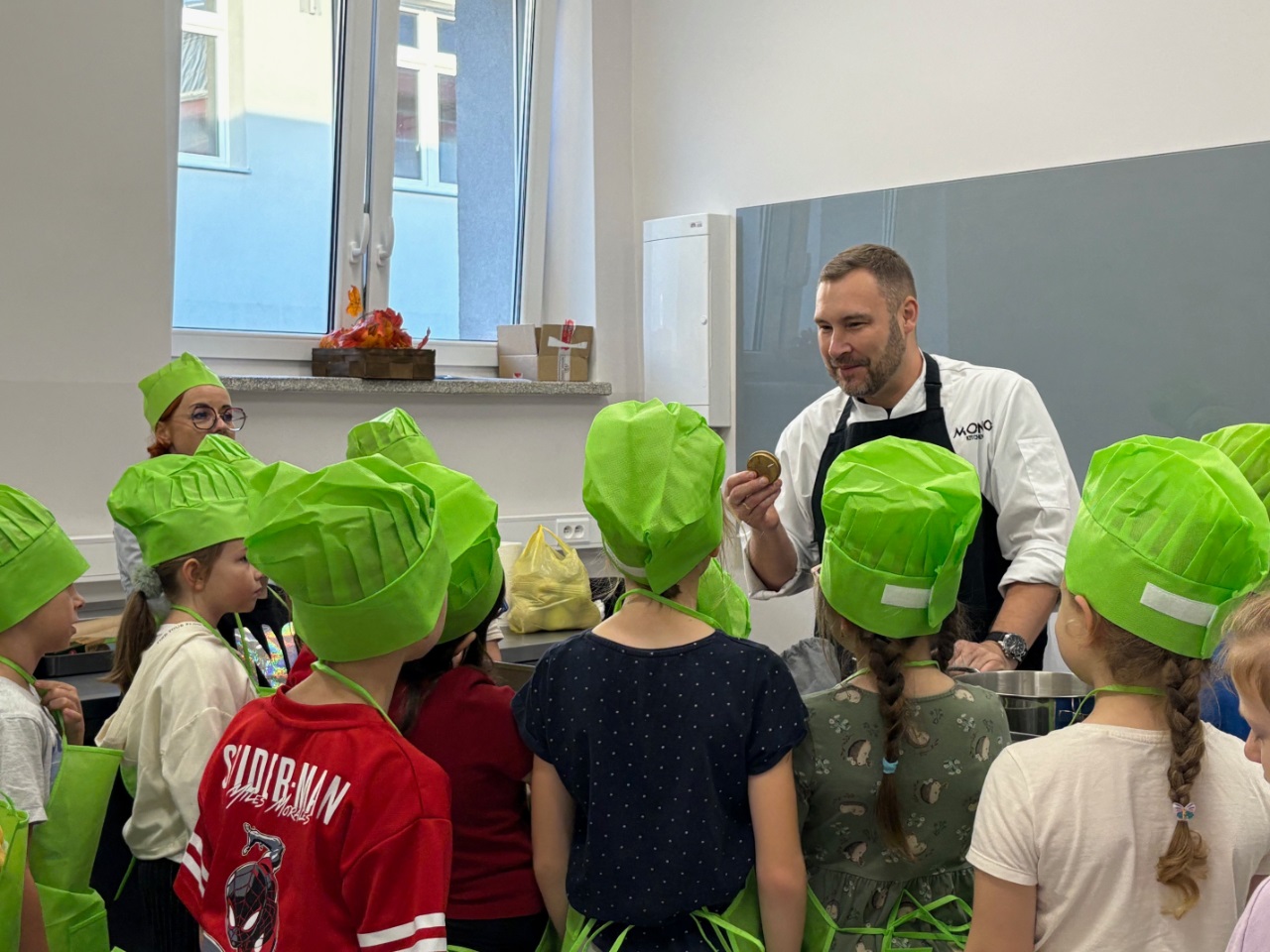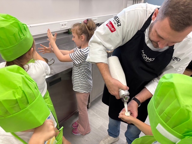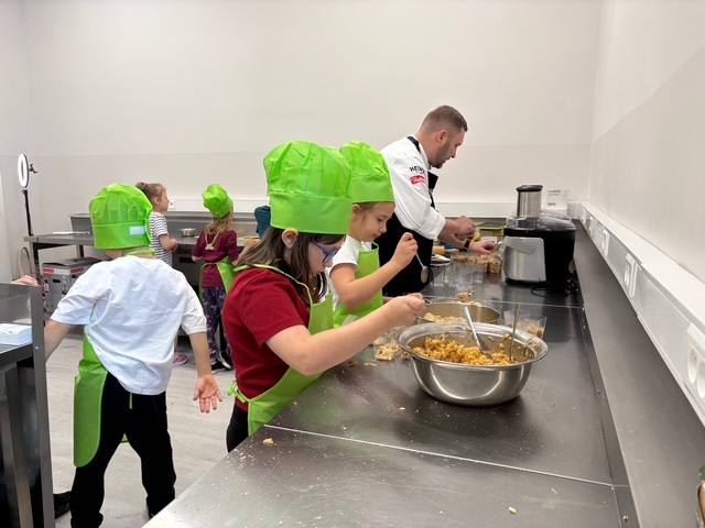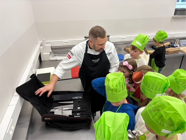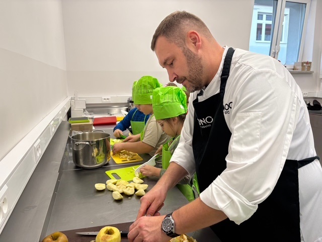 Szef Kuchni Jakub Leyk z MONO Kitchen w Gdańsku pokazał dzieciom, jak w kuchni liczyć proporcje, ważyć składniki i… tworzyć przepyszne monoporcje szarlotki! 🍎✨