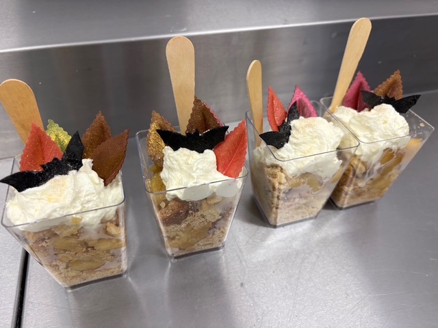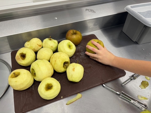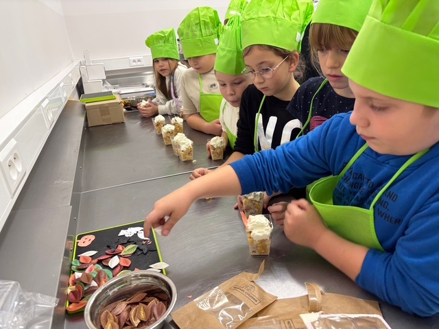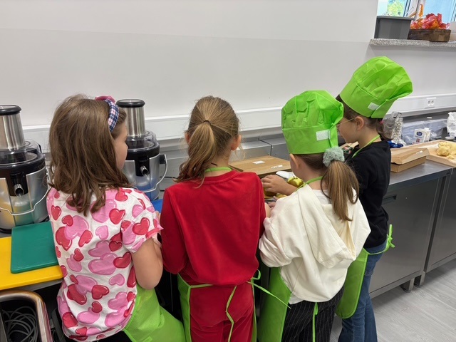 Podczas zajęć uczniowie przygotowali cały deser od początku do końca, dbając o higienę: 🧼 myli ręce i jabłka, 🍏 obierali i kroili owoce, 🥧 wyrabiali i wałkowali ciasto, 🔥 prażyli jabłka, 🥄 składali desery w kubeczkach i dekorowali je z dumą!